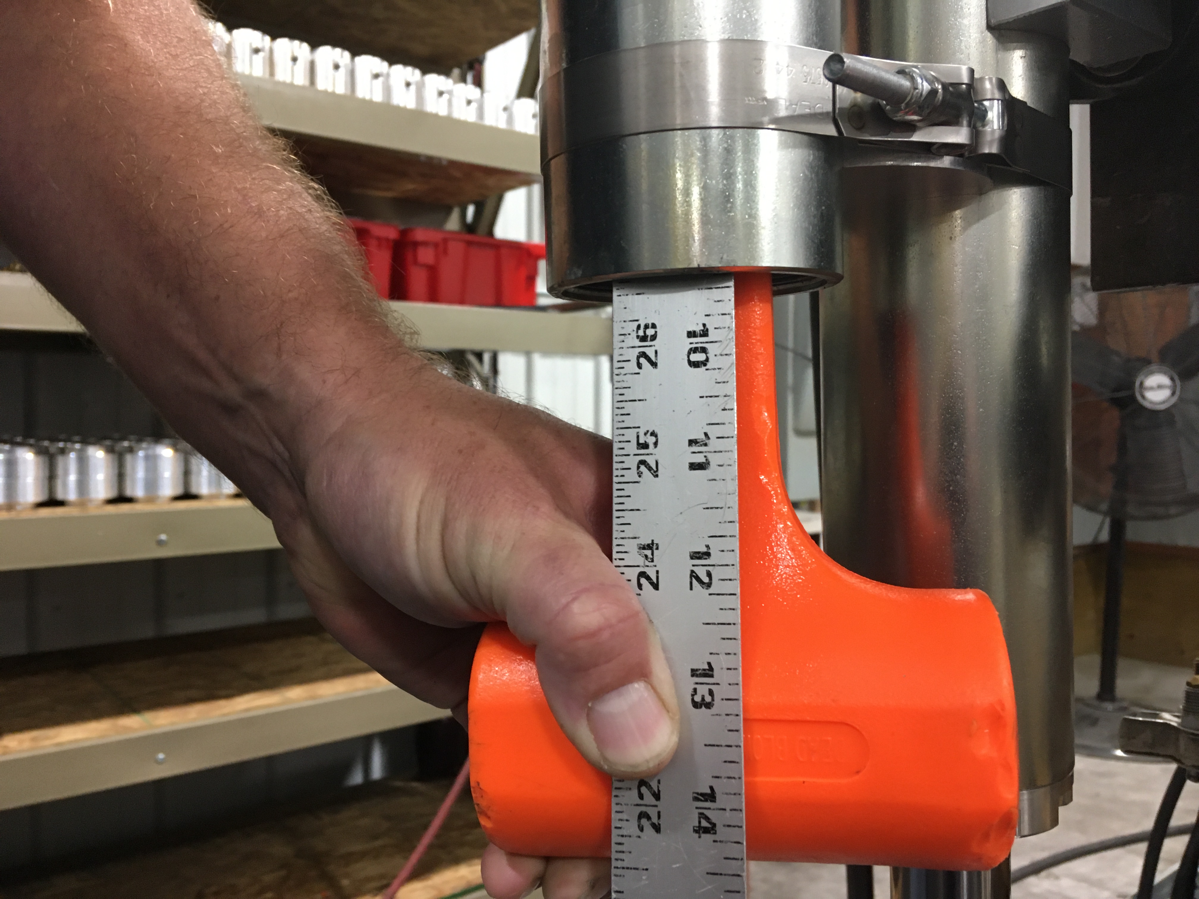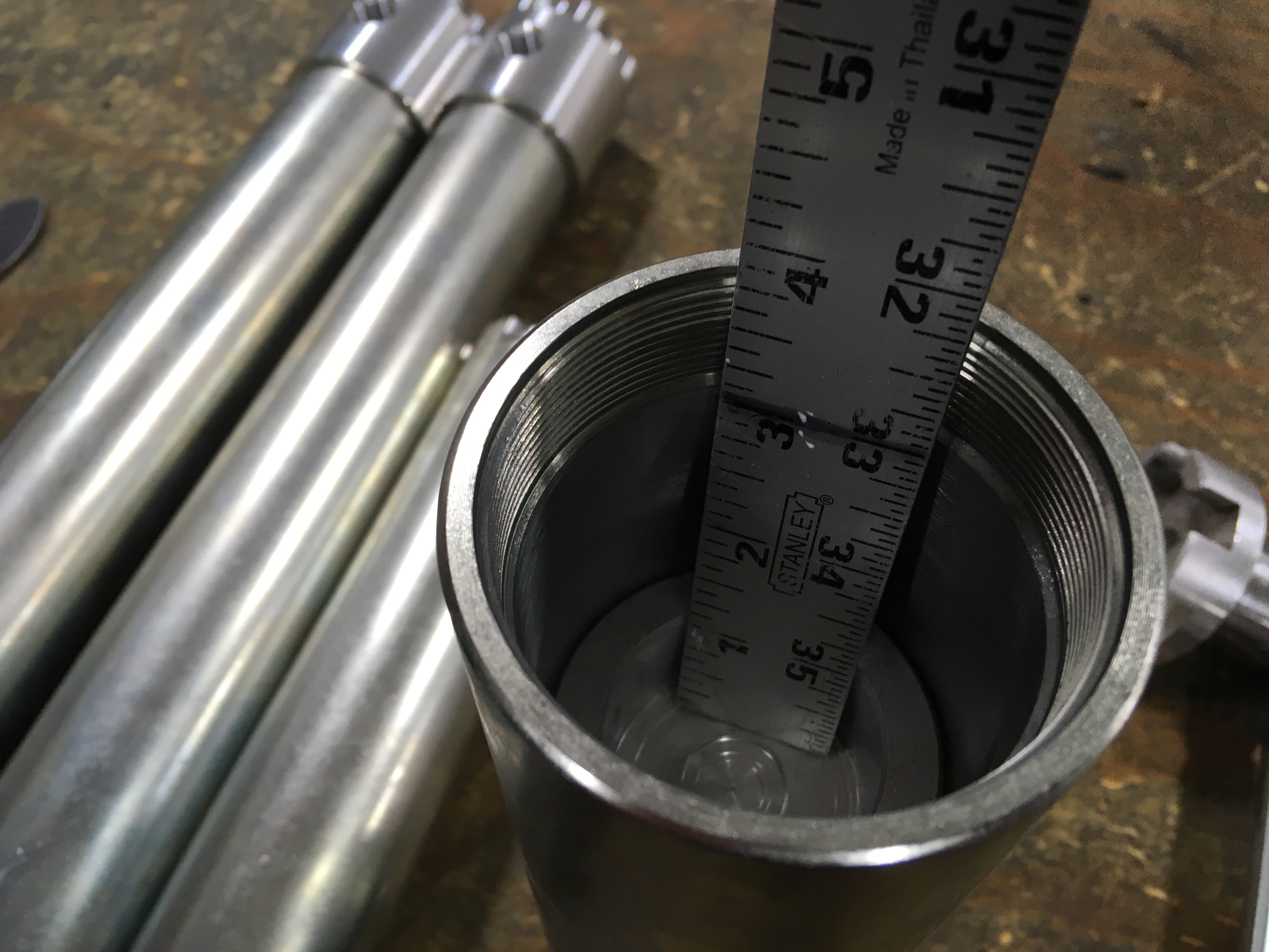 Push the reservoir piston in to set the correct oil level. Measure from the bottom of the piston to the reservoir body.