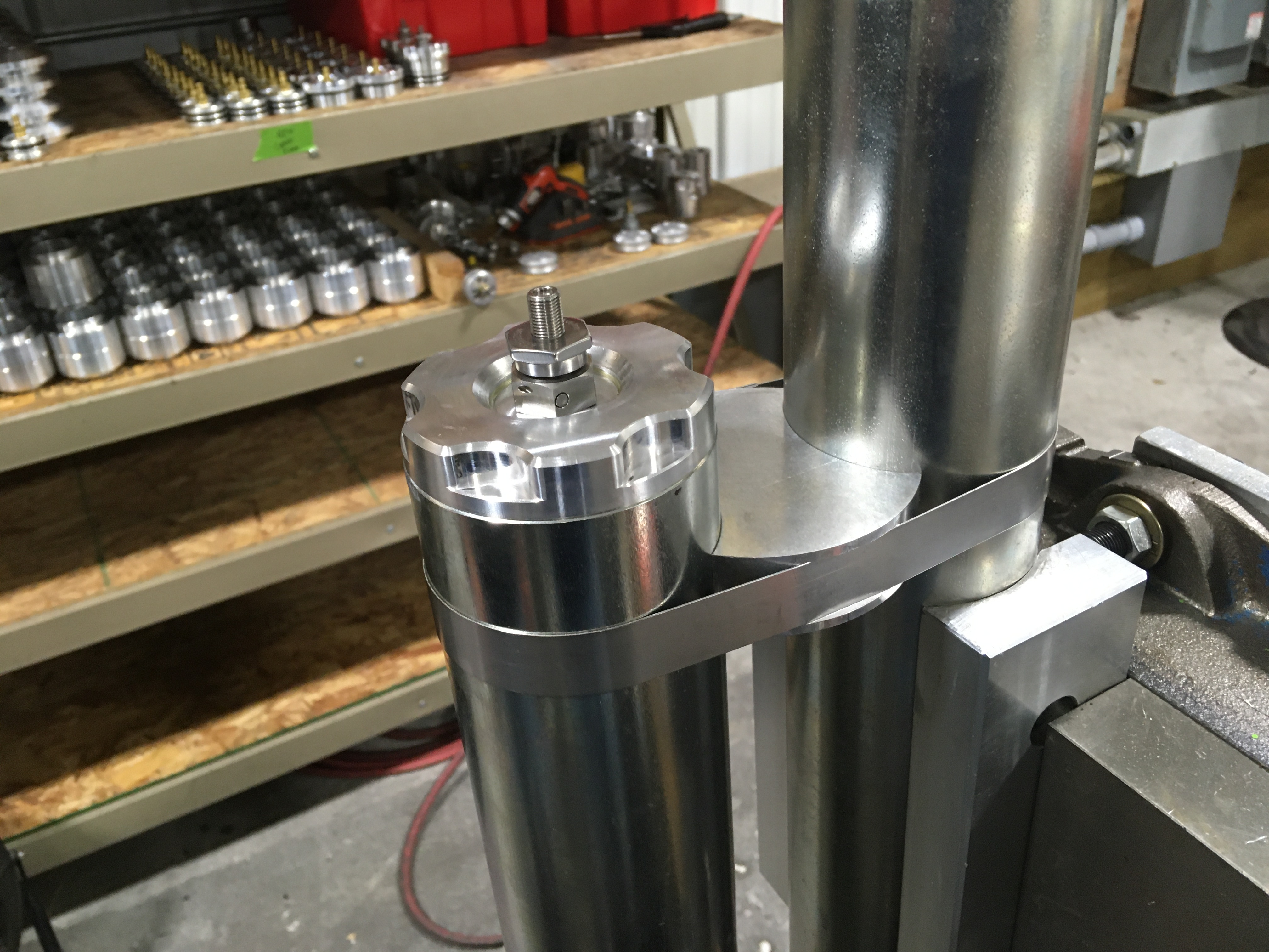 On the air side of the shock, move the reservoir piston down to approximately 3" bottom of piston.
